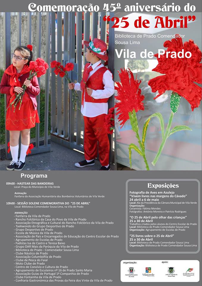 A Biblioteca de Prado – Com. Sousa Lima recebe, no próximo dia 25 de abril, as comemorações concelhias do 45º aniversário da Revolução dos Cravos, que determinou o fim da ditadura e da restauração da liberdade em Portugal. Uma data de indelével importância na história do país que será celebrada com pompa e circunstância. As atividades começam pelas 09h00 em frente à Câmara Municipal de Vila Verde, com o hastear das bandeiras e a intervenção da Banda dos Bombeiros de Vila Verde. As comemorações prosseguem depois a partir das 10H00 e durante toda a manhã na Vila de Prado com animação de rua, passagem de bicicletas e motards e largada de pombos em frente à Biblioteca Comendador Sousa Lima, demonstração de taekwondo, vários momentos musicais e exposições protagonizados por diversas coletividades pradenses. A completar, terá lugar uma Sessão Solene da Assembleia Municipal onde as forças políticas aí representadas, o seu Presidente e o Presidente da Câmara Municipal usarão da palavra. A iniciativa, de entrada gratuita e aberta a toda a população, resulta de uma organização conjunta entre o Município e a Assembleia Municipal de Vila Verde, com o apoio da Junta de Freguesia da Vila de Prado e do Regimento de Cavalaria 6 (Braga).