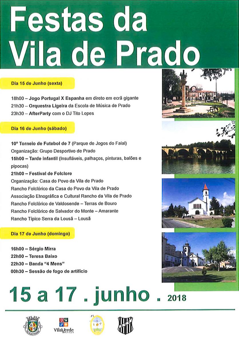 Está tudo preparado para a edição de 2018 das Festas da Vila de Prado, que chega com bagagem para três dias (15 a 17 de junho) de convívio, alegria e muita animação. Música popular, fado, folclore, tradição, fogo de artifício, desporto, after-party e muito, muito mais, durante o evento que celebra o 27º aniversário da elevação de Prado a vila. A efeméride celebra-se a 20 de junho, mas, como é habitual, as festividades desenrolam-se no fim-de-semana mais próximo da data. As iguarias da gastronomia regional são outro dos destaques do cartaz, já que por esta altura o Largo de S. Sebastião (vulgo Campo da Feira) se transforma num autêntico festival de gastronomia regional. Nota de realce ainda para a transmissão em direto do jogo Portugal Espanha (16/06 – 18h00) com ecrã gigante.